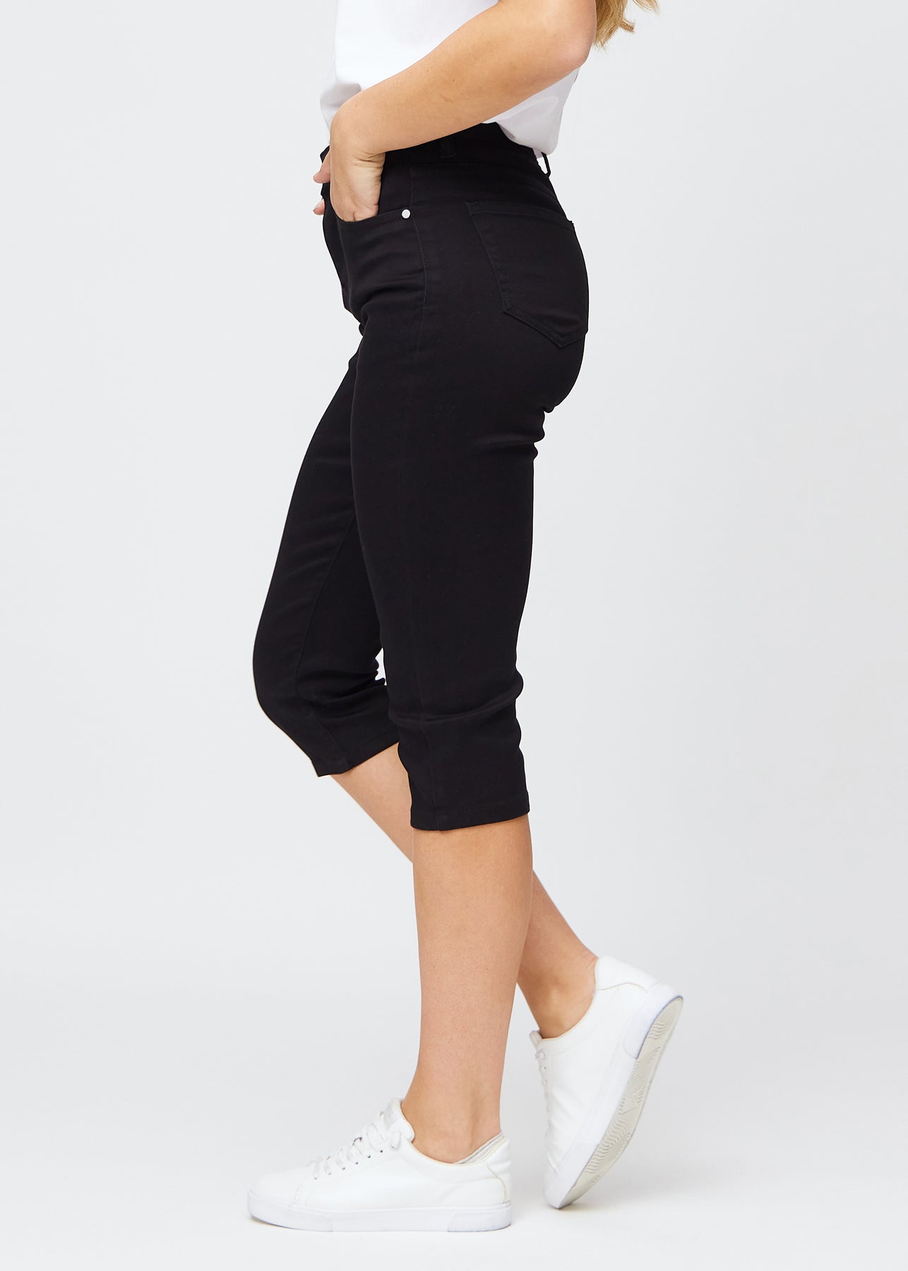 Sorte slim capris, farve Ravens, med tætsiddende pasform der former benene og slutter lige under knæet – set forfra.