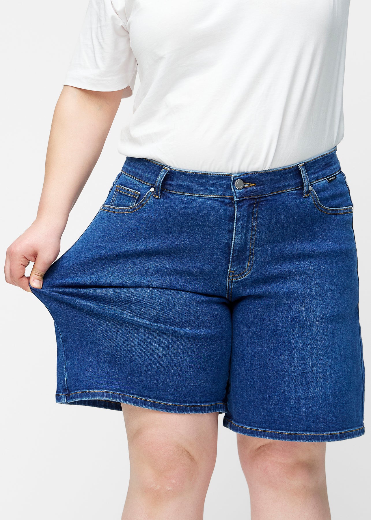 Plus-size model strækker de løse, mørkeblå denim shorts i farven Oceans ved hoften for at vise materialets stretch.