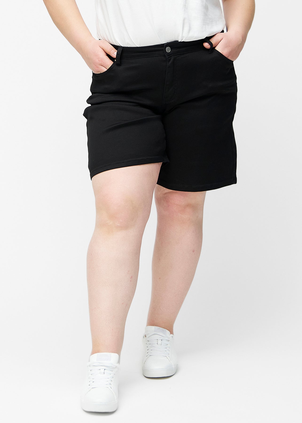 Fuldt billede af plus-size model i løse, sorte shorts i farven Ravens, der går til lige over knæet.