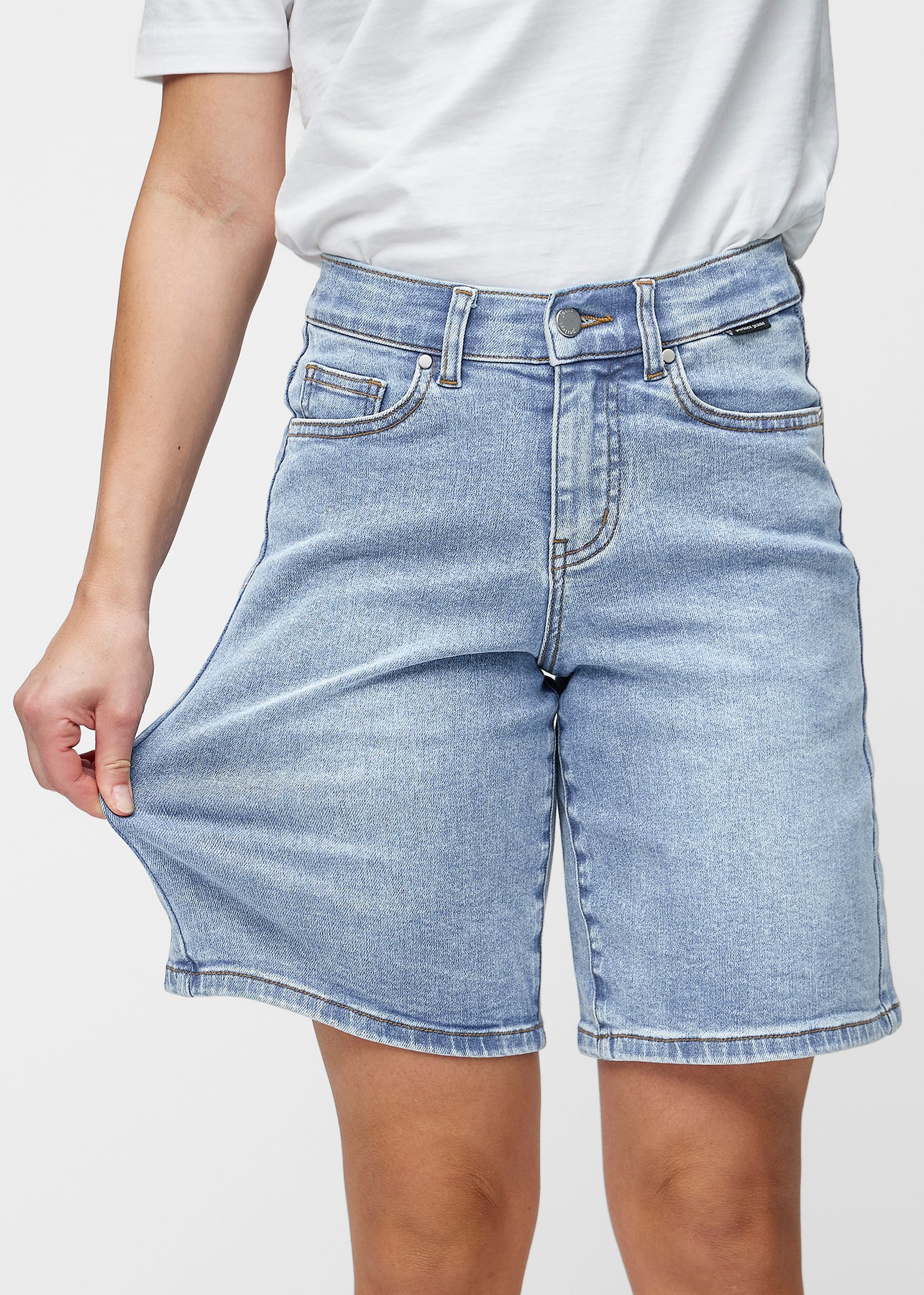 Perfect Shorts - Middle - Loose in Waves sind hellblaue Denim Shorts für Frauen mit einem leichten und modernen Ausdruck. Die Passform sitzt an der Hüfte und fällt locker über die Oberschenkel für eine entspannte Silhouette. Die Shorts reichen bis knapp über das Knie und sind unser weitestes Modell. Die breite Form sorgt für Luft und Bewegungsfreiheit, während die tiefen Taschen vorne und hinten sie im Alltag praktisch machen.