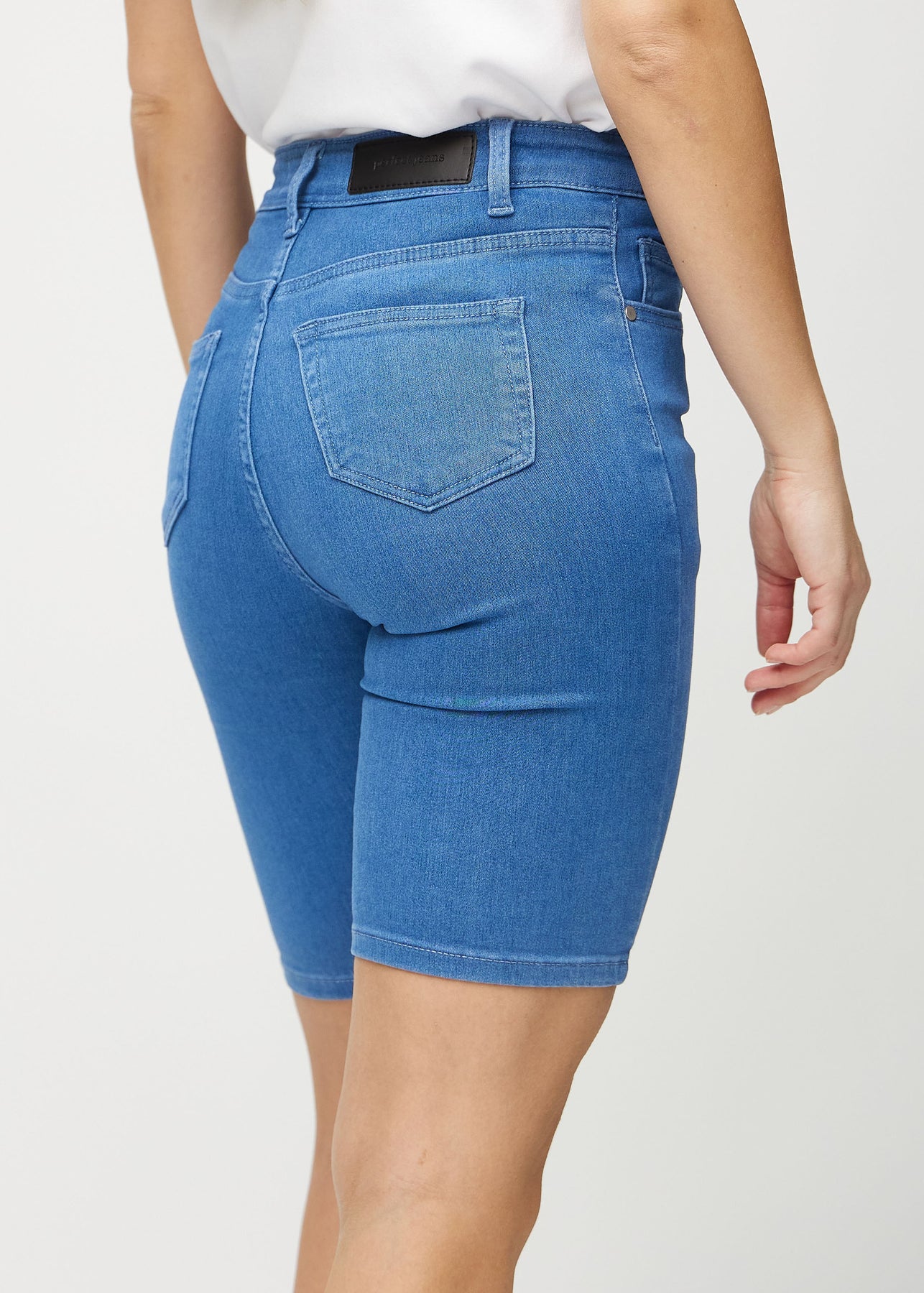 Baglommen på et par blå skinny middle shorts, hvor man kan se logoet på en plus-size model.